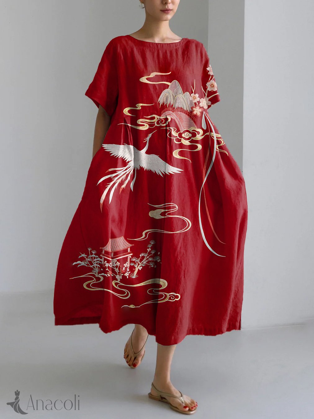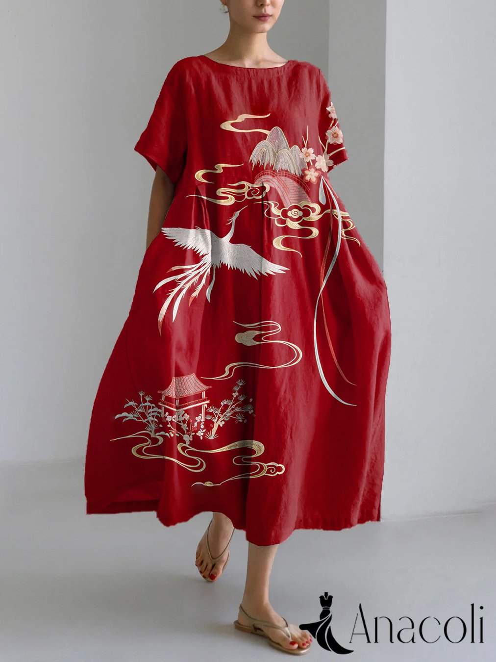 Asian Art Phoenix Print Linen Blend Maxi Dress