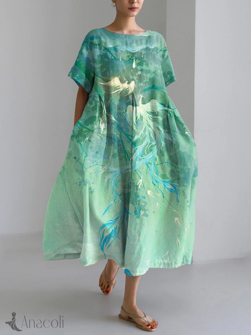 Asian Art Phoenix Print Linen Blend Maxi Dress