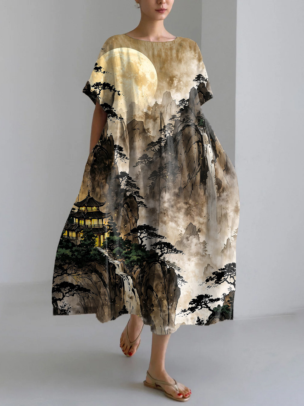 Asian Art Print Linen Blend Maxi Dress