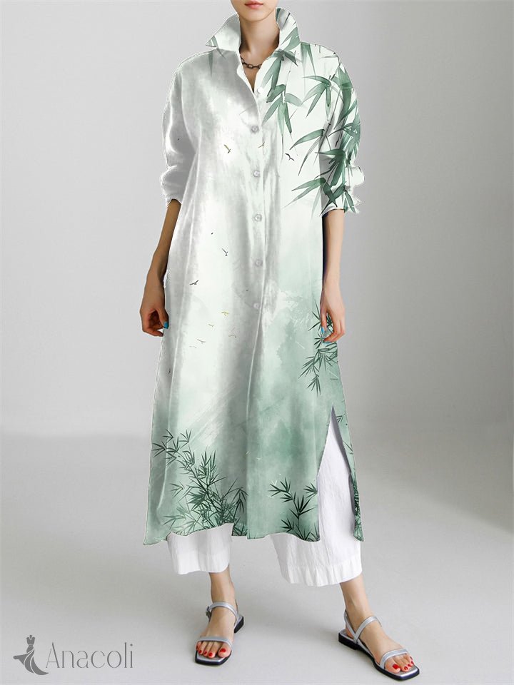 Bamboo Forest Asian Art Print Long Sleeve Slit Shirt Dress