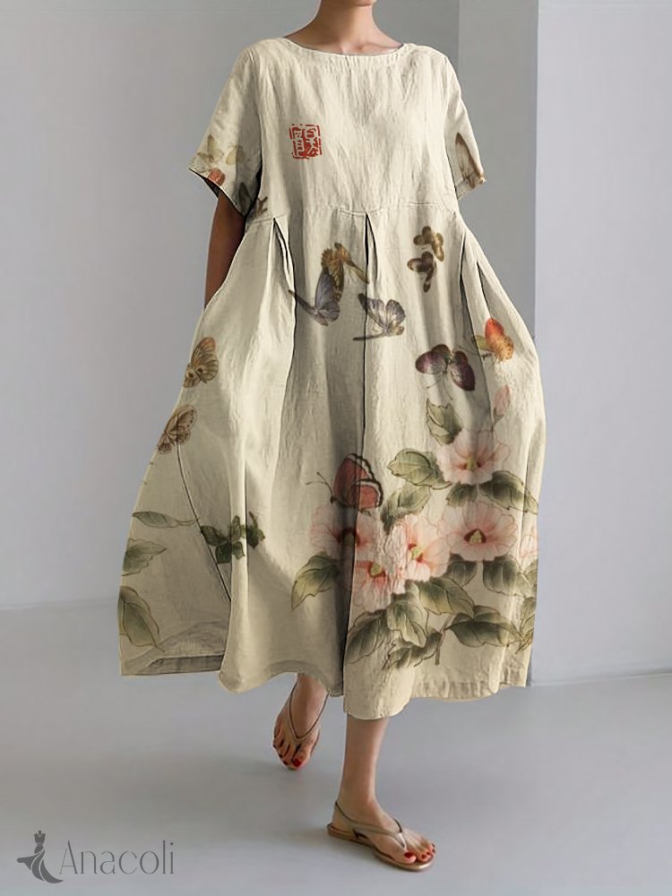 Butterflies & Flowers Japanese Art Linen Blend Maxi Dress