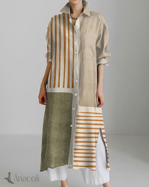 Casual Abstract Art Print Cotton and Linen Long Sleeve Slit Shirt Dress