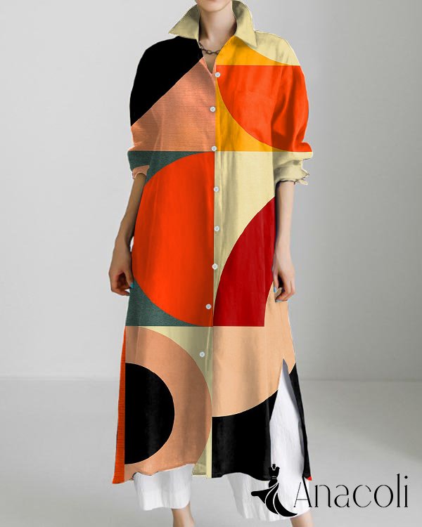 Casual Abstract Art Print Cotton and Linen Slit Cardigan Dress