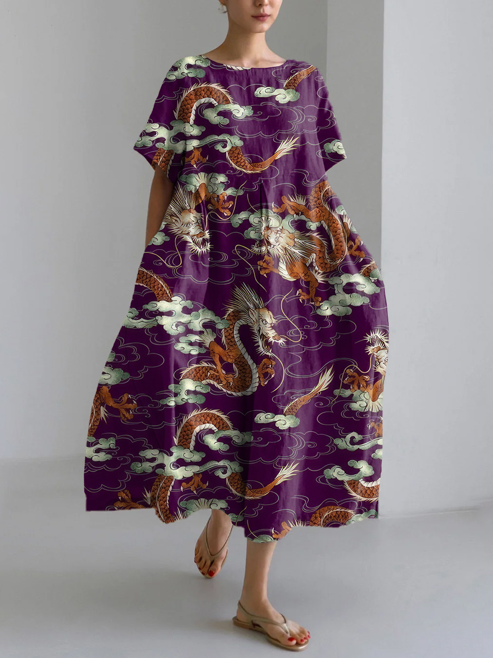 Dragon Asian Art Print Linen Blend Maxi Dress