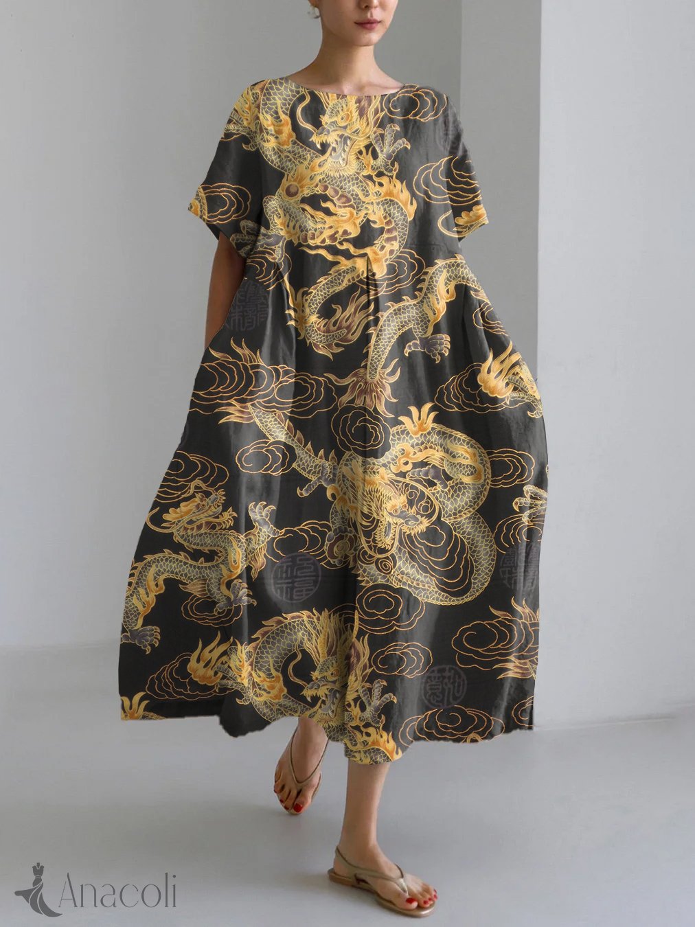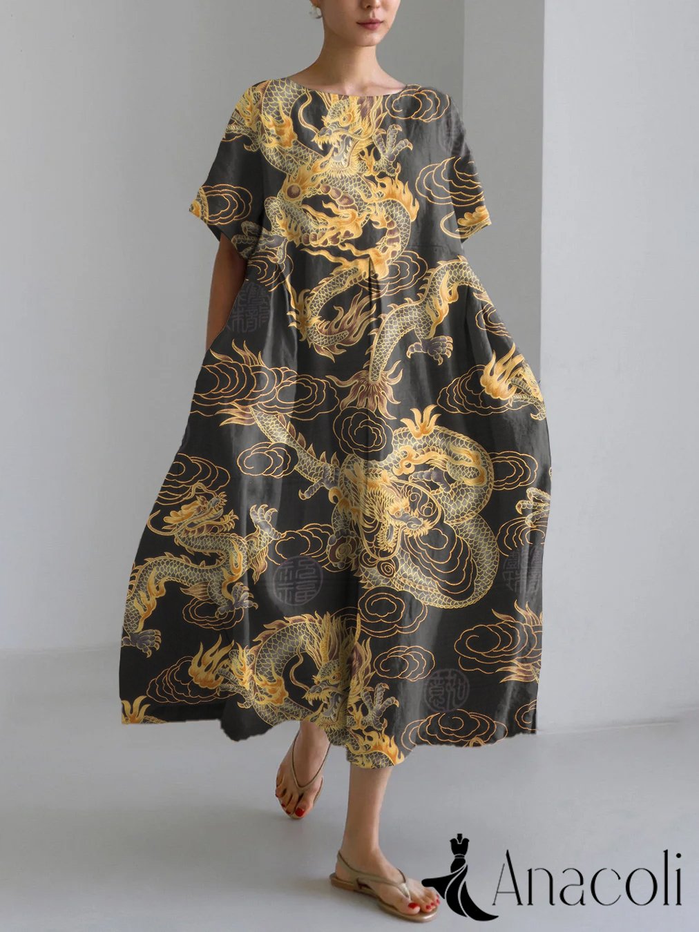 Dragon Asian Art Print Linen Blend Maxi Dress