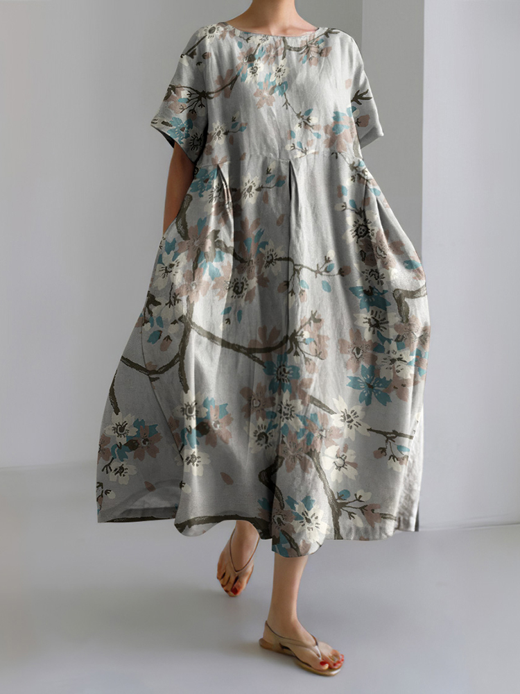 Floral Print Round Neck Short Sleeve Loose Midi Dress