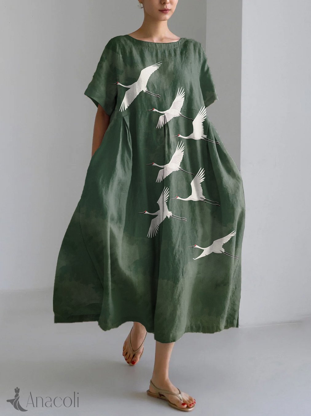 Flying Cranes Japandi Style Print Linen Blend Maxi Dress