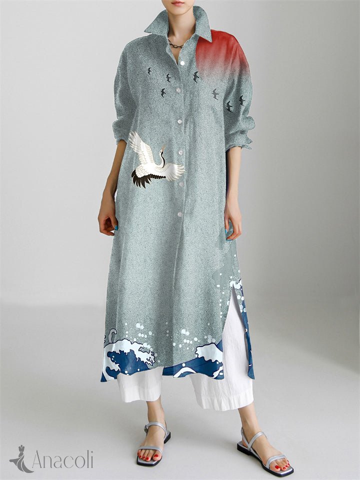 Flying Cranes Japanese Art Pattern Long Sleeve Slit Shirt Dress