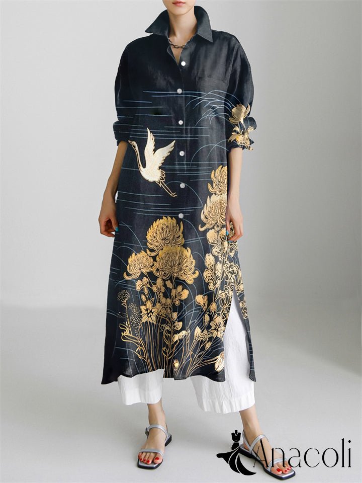 Golden Chrysanthemum Flying Crane Art Pattern Long Sleeve Slit Shirt Dress