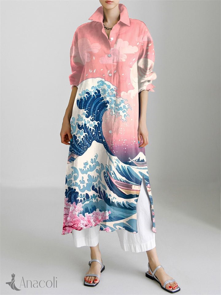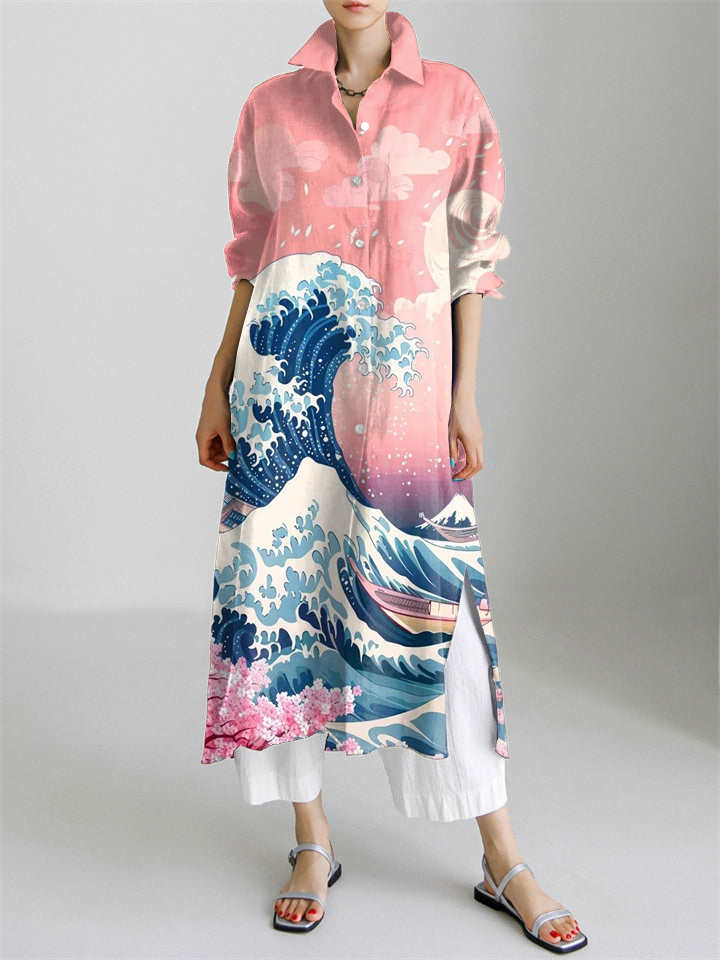 Great Wave Japanese Art Print Long Sleeve Slit Shirt Dress