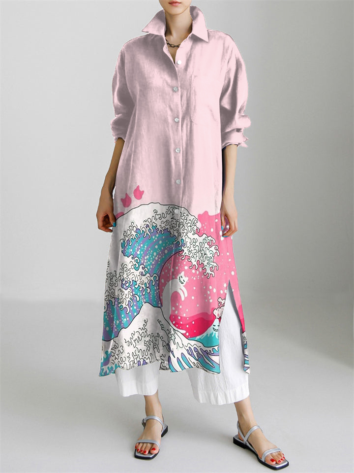 Great Wave Japanese Art Print Long Sleeve Slit Shirt Dress