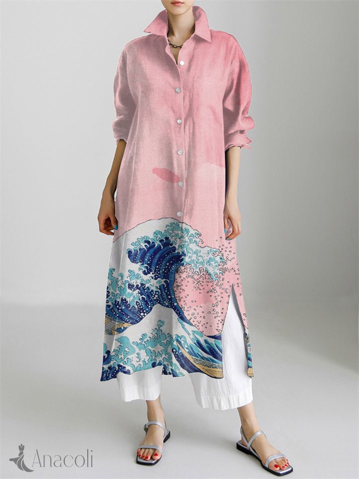Great Wave Japanese Art Print Long Sleeve Slit Shirt Dress