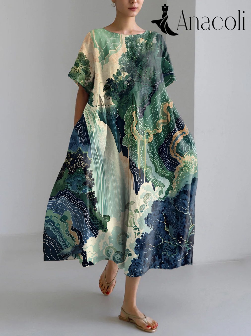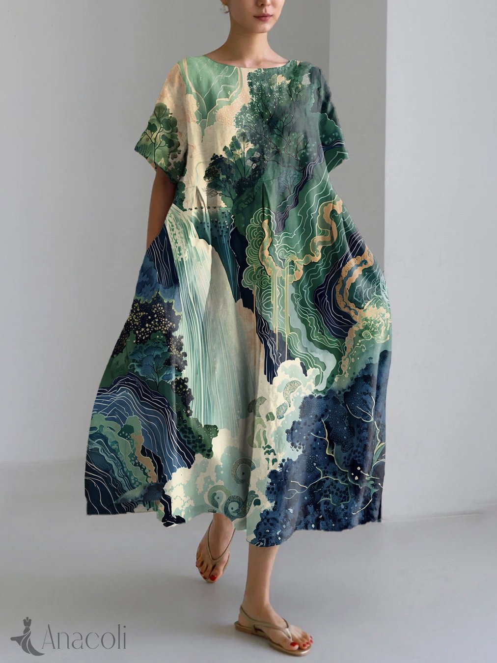 Hokusai Ukiyo-e Japanese Waterfall Art Landscape Print Linen Blend Maxi Dress