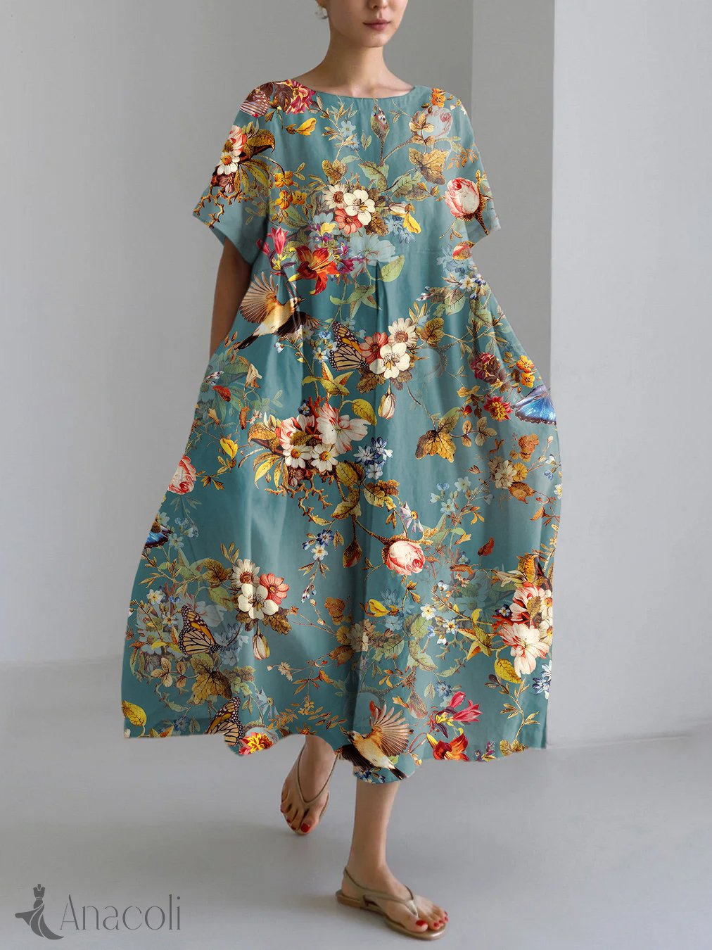 Japanese Art Birds And Flowers Print Linen Blend Maxi Dress