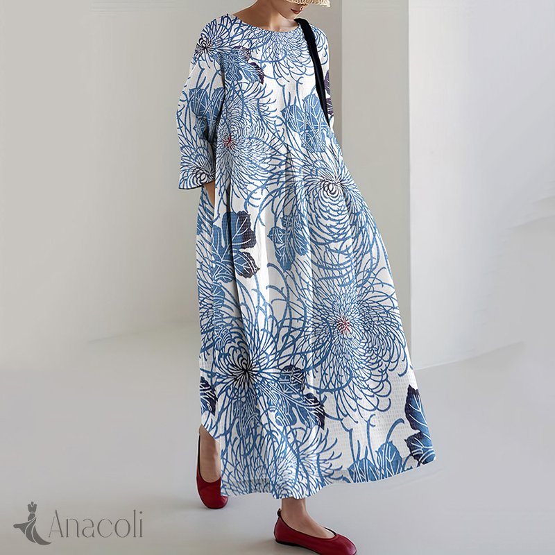 Japanese Art Chrysanthemum Print Loose Midi Dress