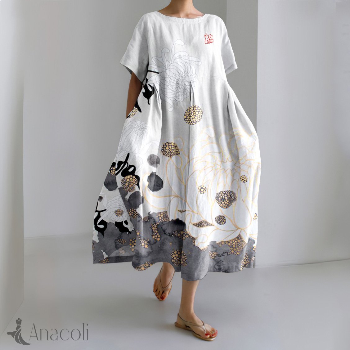 Japanese Art Chrysanthemum Print Short Sleeve Midi Dress