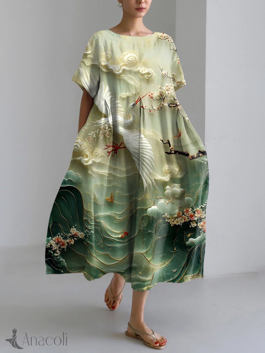 Japanese Art Crane Print Linen Blend Maxi Dress