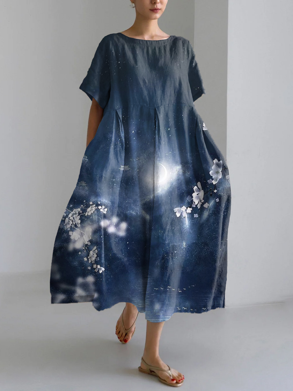 Japanese Art Floral Print Linen Blend Maxi Dress