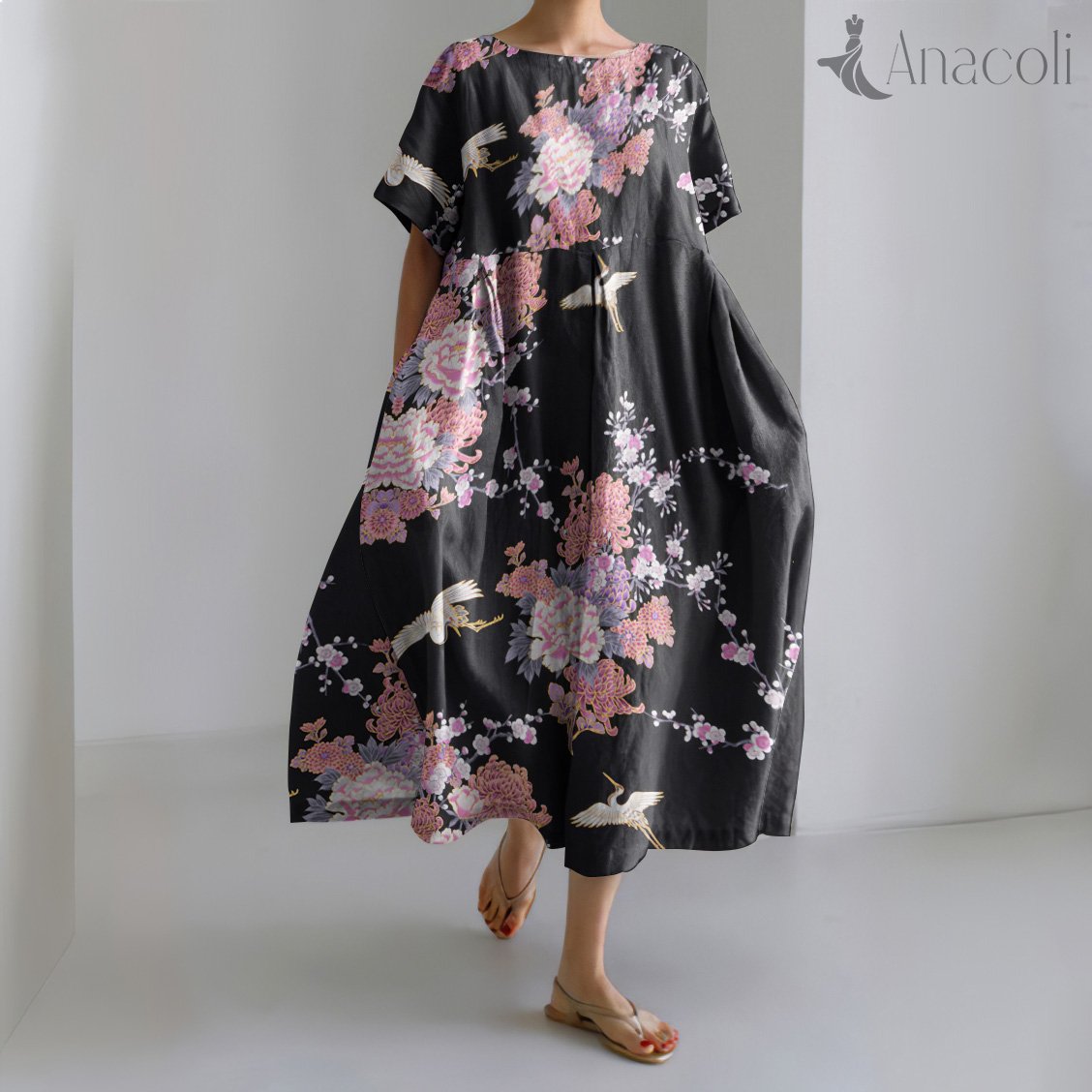 Japanese Art Flower Print Short Sleeve Midi Dress