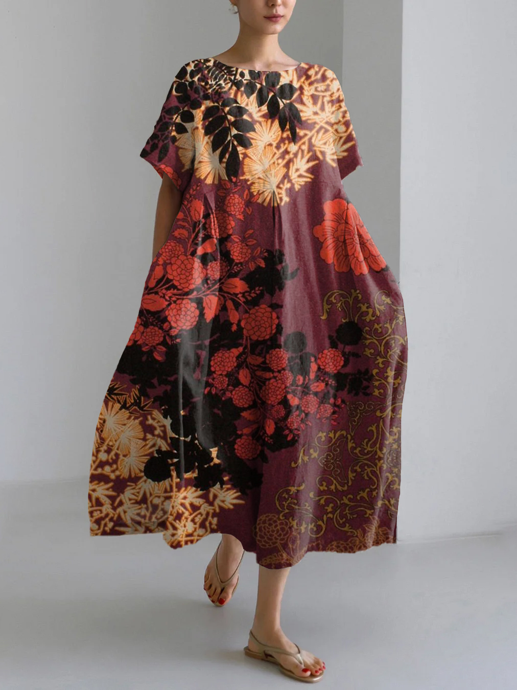 Japanese Art Flowers Print Linen Blend Maxi Dress