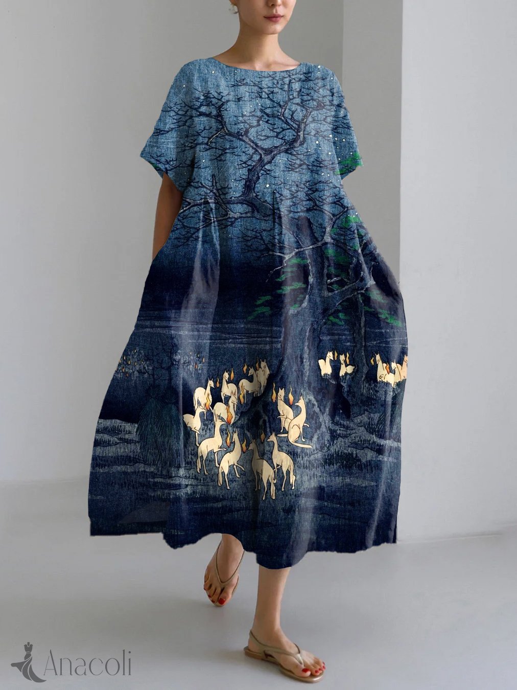 Japanese Art Fox Meeting Print Linen Blend Maxi Dress