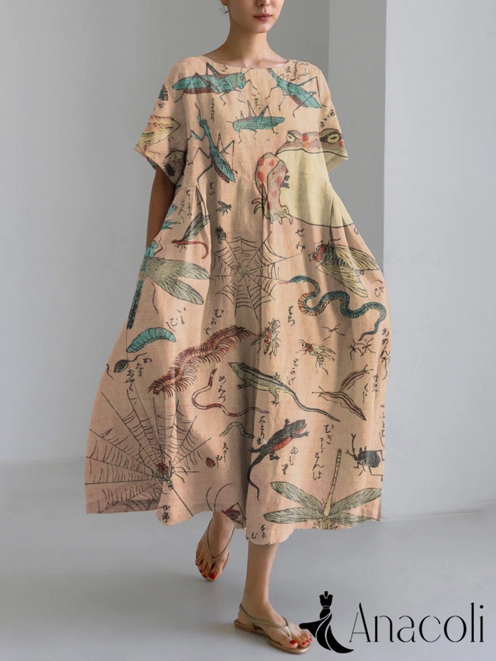 Japanese Art Frogs Insects Crutters Print Linen Blend Maxi Dress
