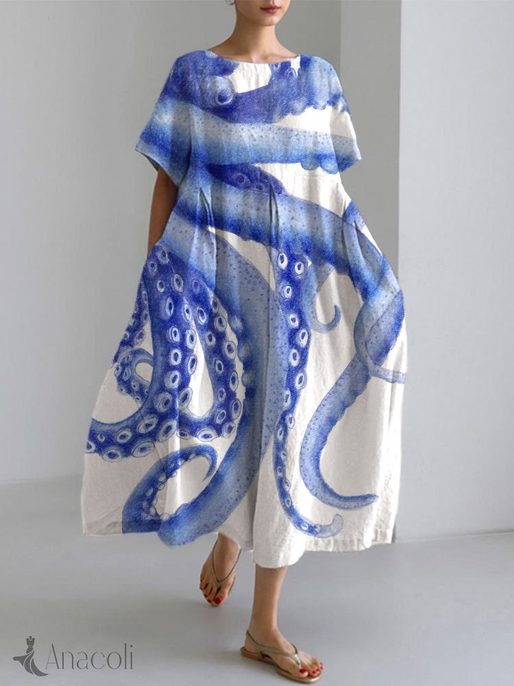 Japanese Art Ocean Octopus Print Cotton Blend Dress