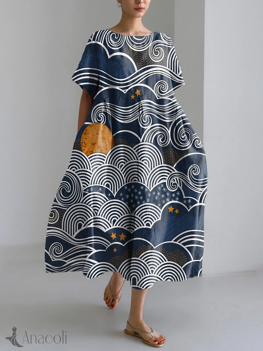 Japanese Art Print Linen Blend Maxi Dress