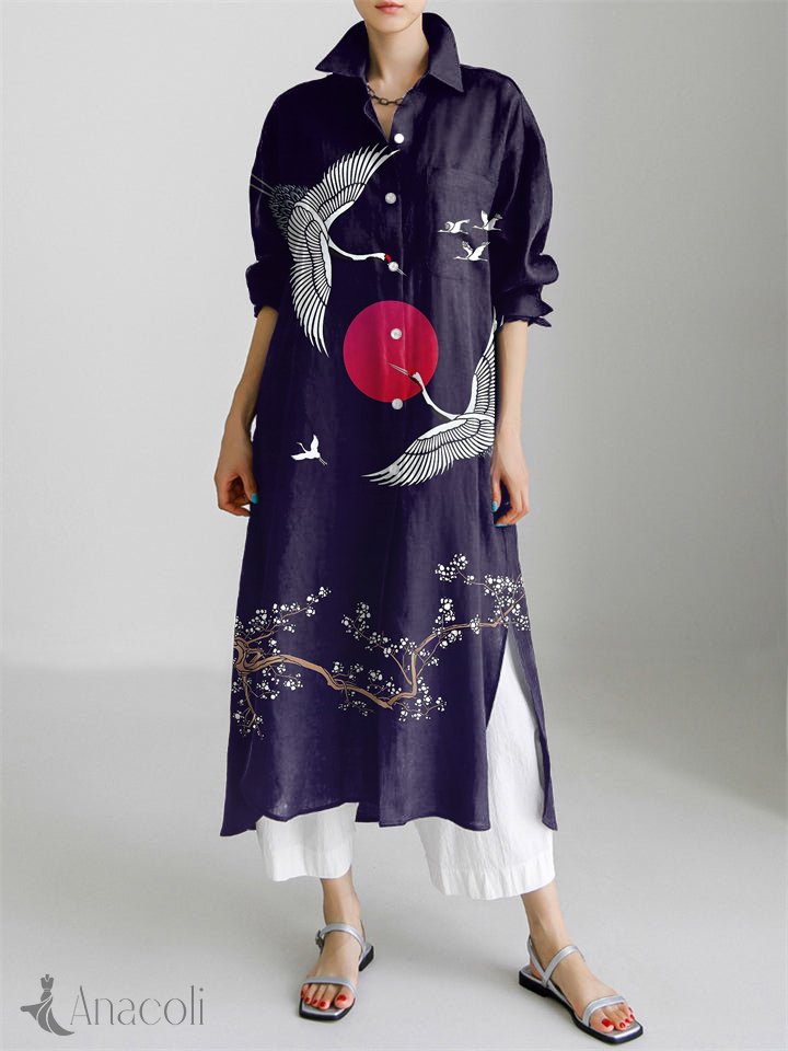 Japanese Art Vintage Crane Art Print Long Sleeve Slit Shirt Dress
