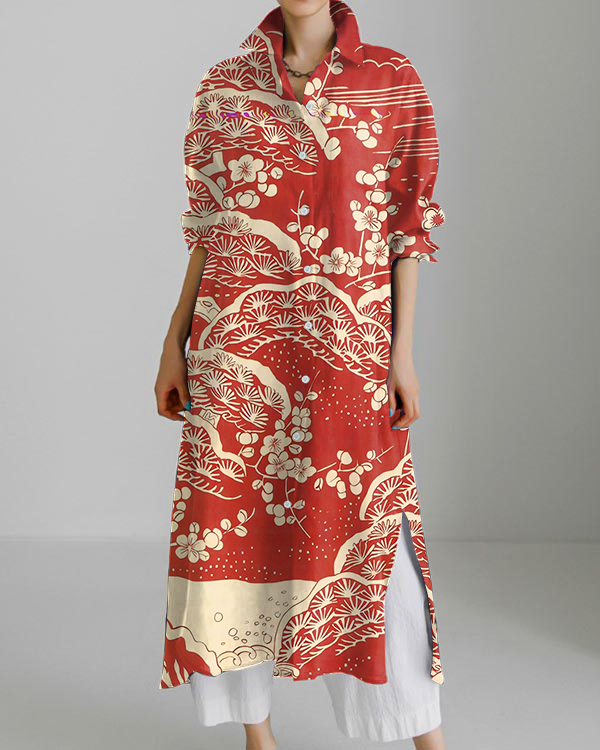 Japanese Classic Plum Blossom Long Sleeve Slit Shirt Dress