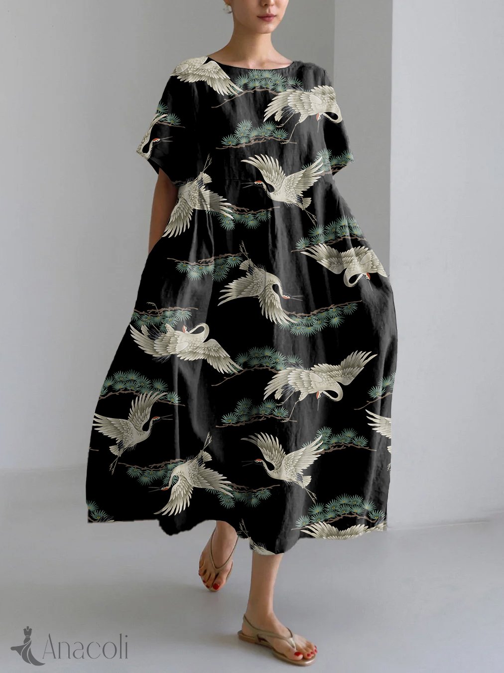 Japanese Cranes & Pine Art Pattern Linen Blend Maxi Dress