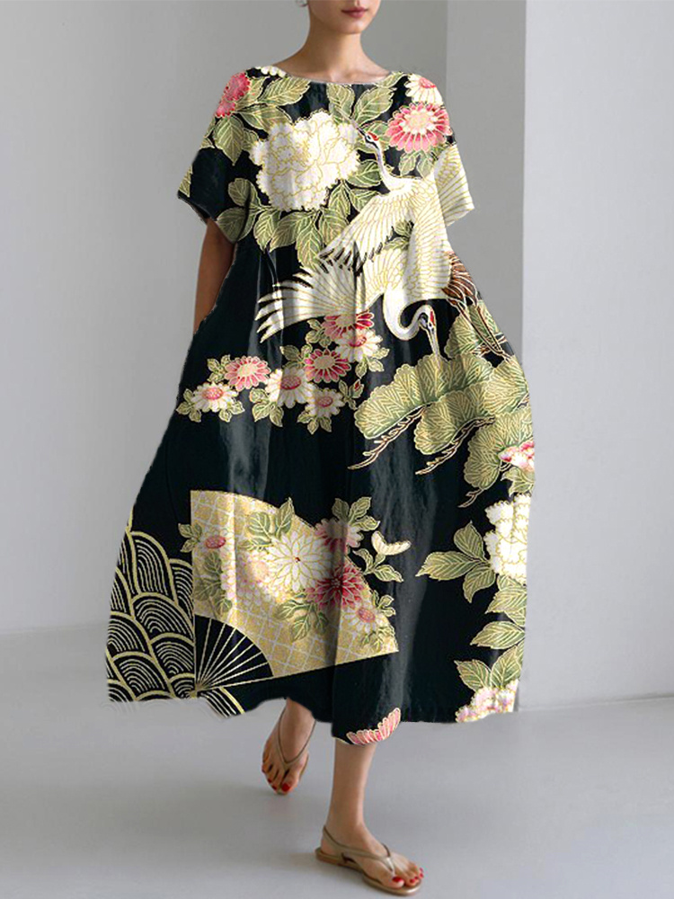 Japanese Floral Traditional Pattern Print Linen Blend Dress