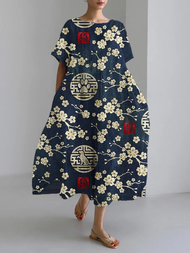 Japanese Sakura & Pet Dog Women's Linen Maxi Dress