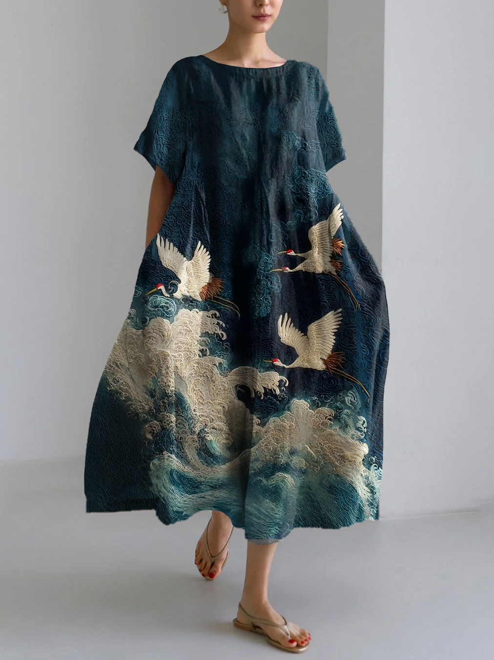 Japanese Wave & Crane Print Linen Blend Maxi Dress