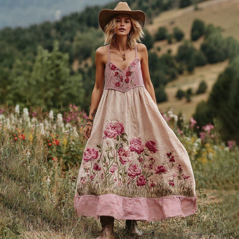 Love & Health Collection Retro Western Women Style Vintage Pink Striped And Floral Patchwork Art Linen Suspender Dress
