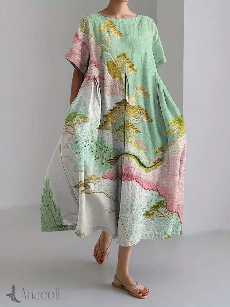 Spring Landscape Japanese Art Pattern Linen Blend Maxi Dress
