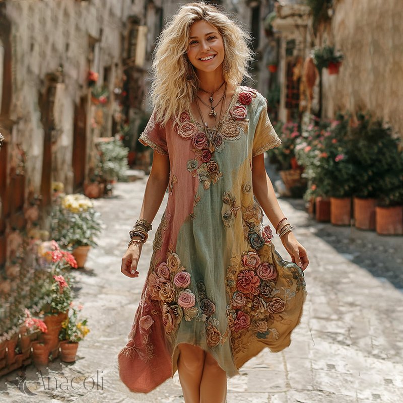 The Ice Cream Collection Women's Classic Bohemian Floral And Rose Gradient Art Linen V Neck Midi Dress