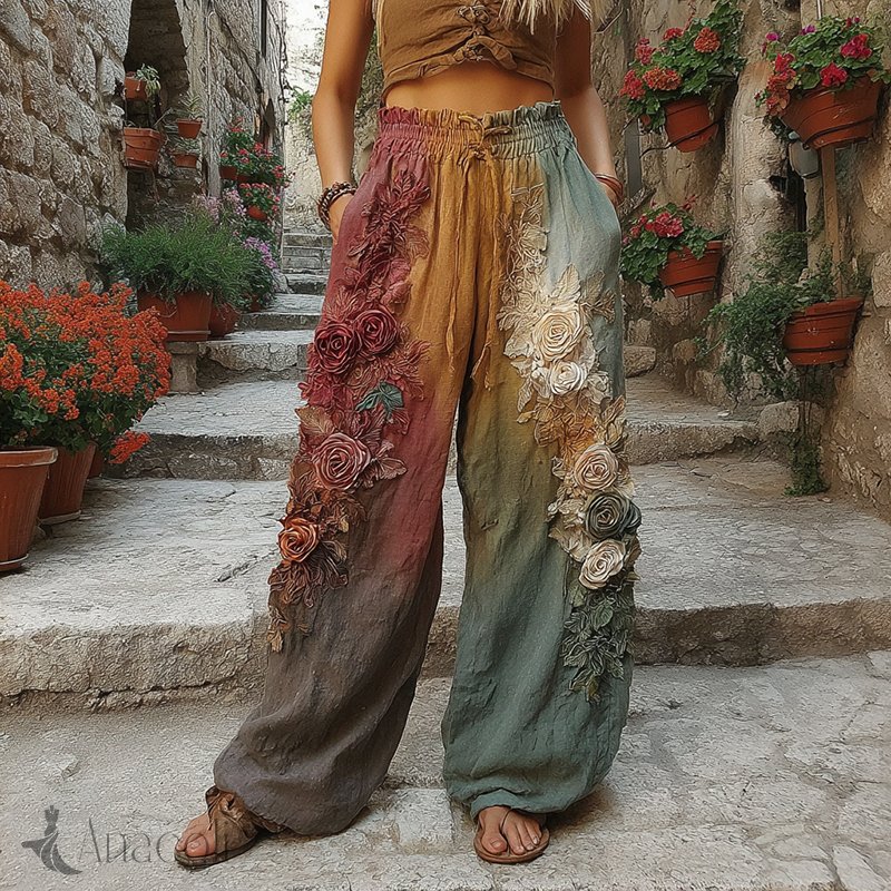 The Sunset Collection Classic Retro Rose And Floral Gradient Art Linen Pants