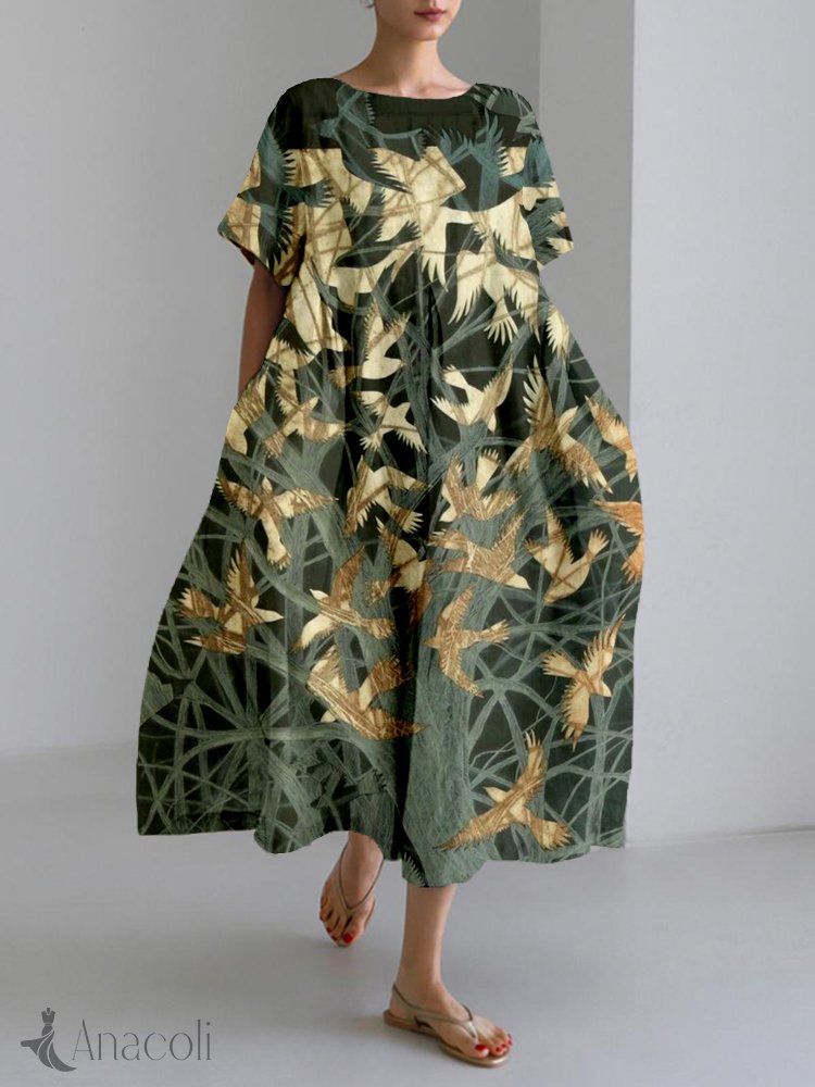 Vintage Birds Art Pattern Linen Blend Cozy Maxi Dress