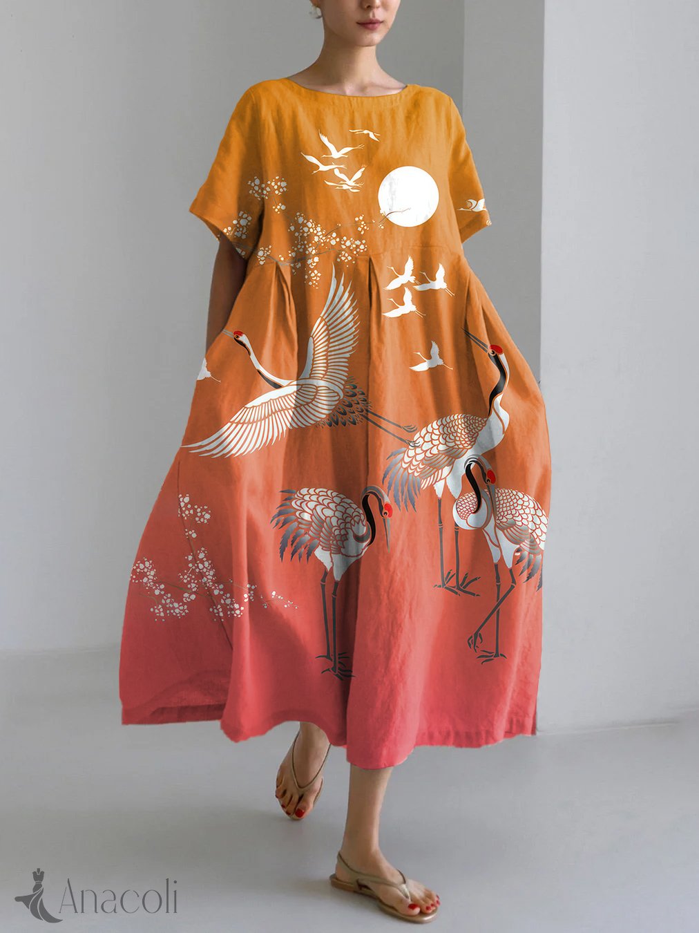 Vintage Crane Art Print Linen Blend Maxi Dress