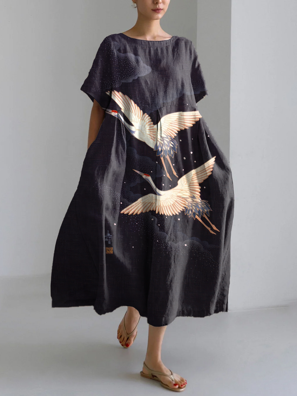 Vintage Crane Japanese Art Print Linen Blend Maxi Dress