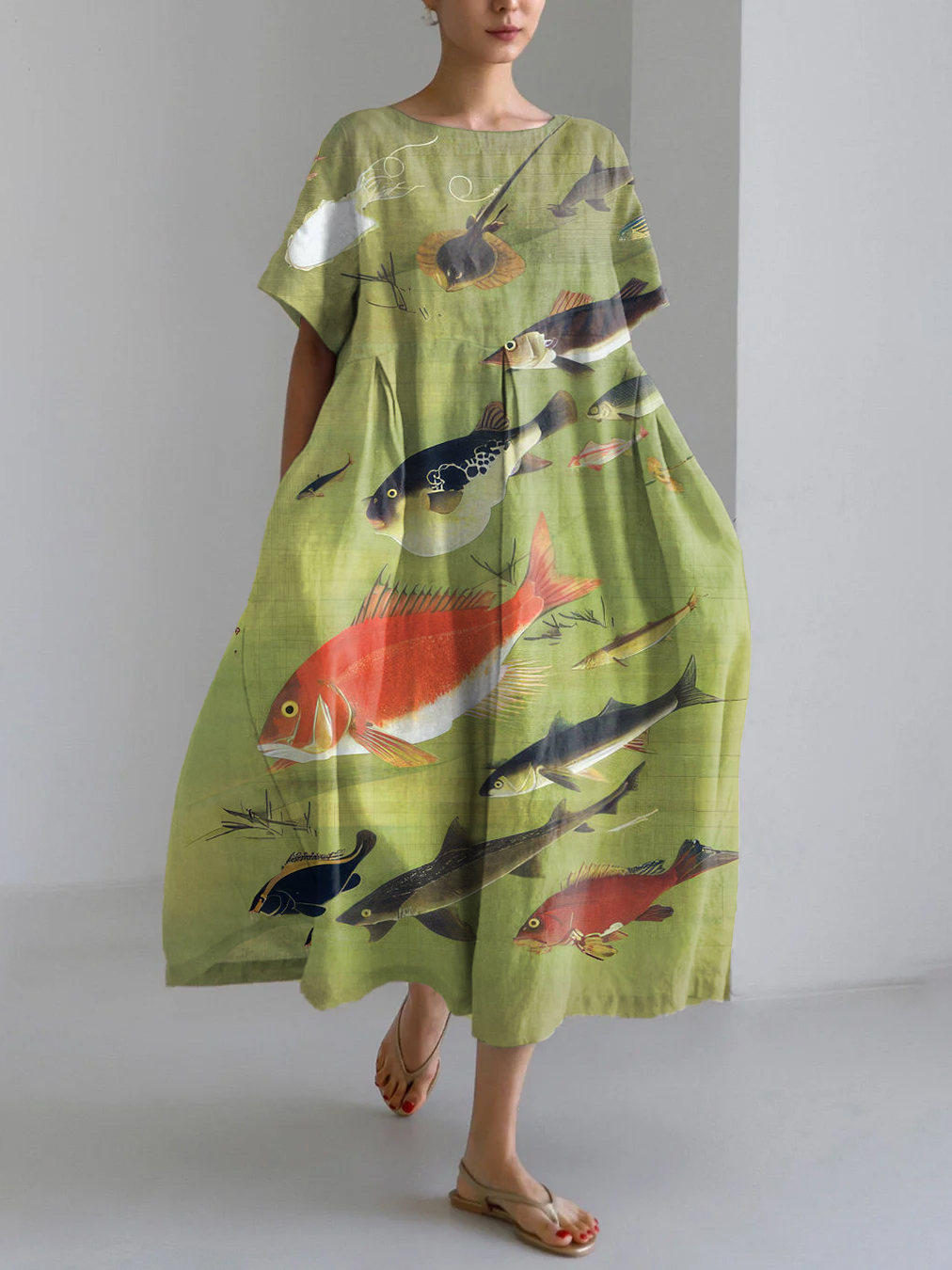 Vintage Fish Art Print Linen Blend Maxi Dress