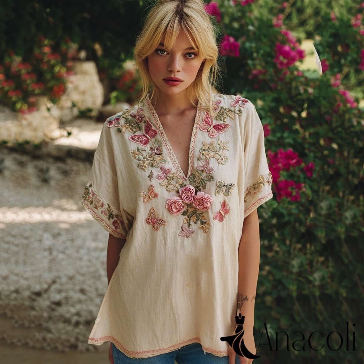 Vintage Floral Butterfly Embroidery Art Short Sleeve Linen Blend T-shirt