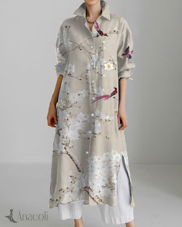 Vintage Floral Long Sleeve Slit Shirt Dress