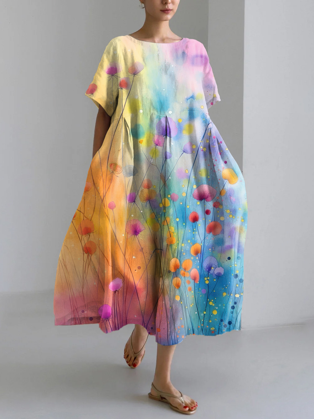 Vintage Flower Art Print Linen Blend Maxi Dress