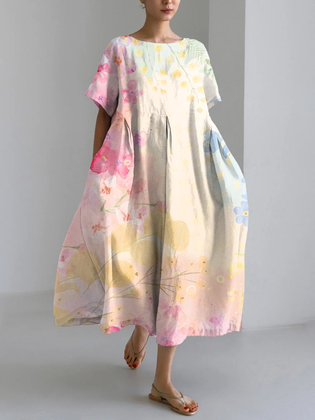 Vintage Flower Art Print Linen Blend Maxi Dress