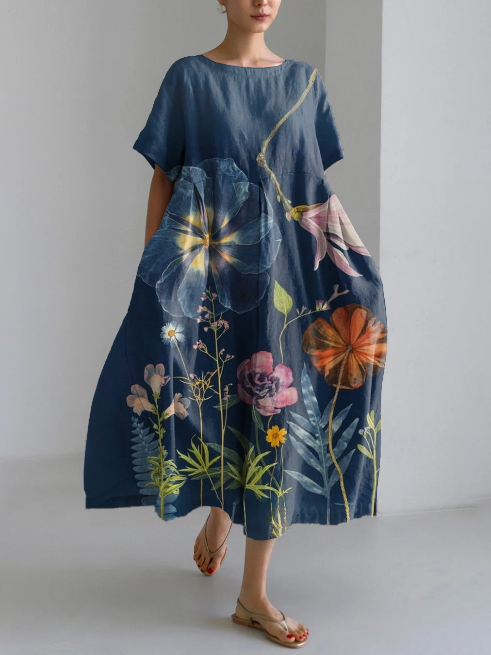 Vintage Flower Japanese Art Print Linen Blend Maxi Dress