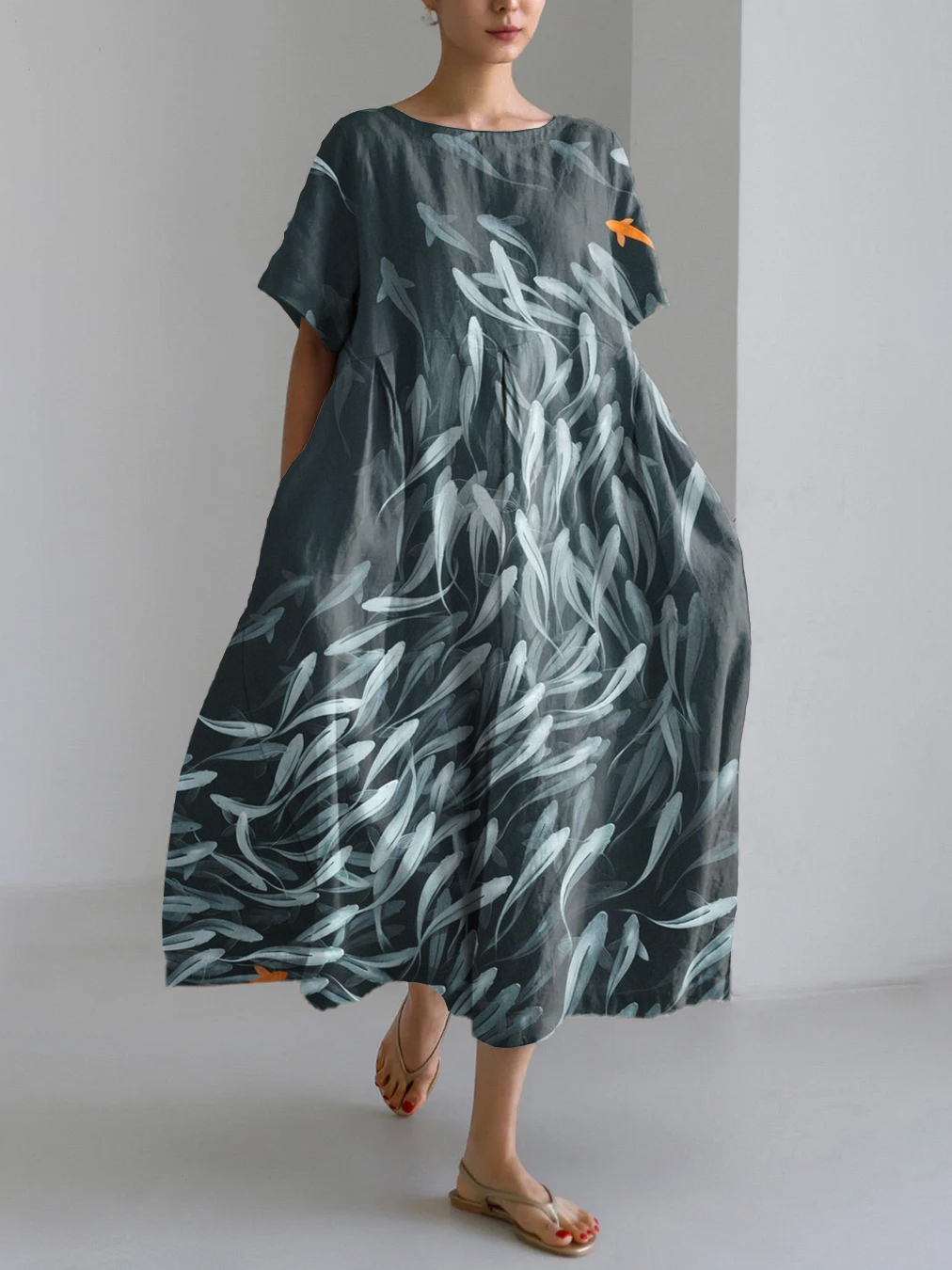 Vintage Japanese Art Fish Print Linen Blend Maxi Dress