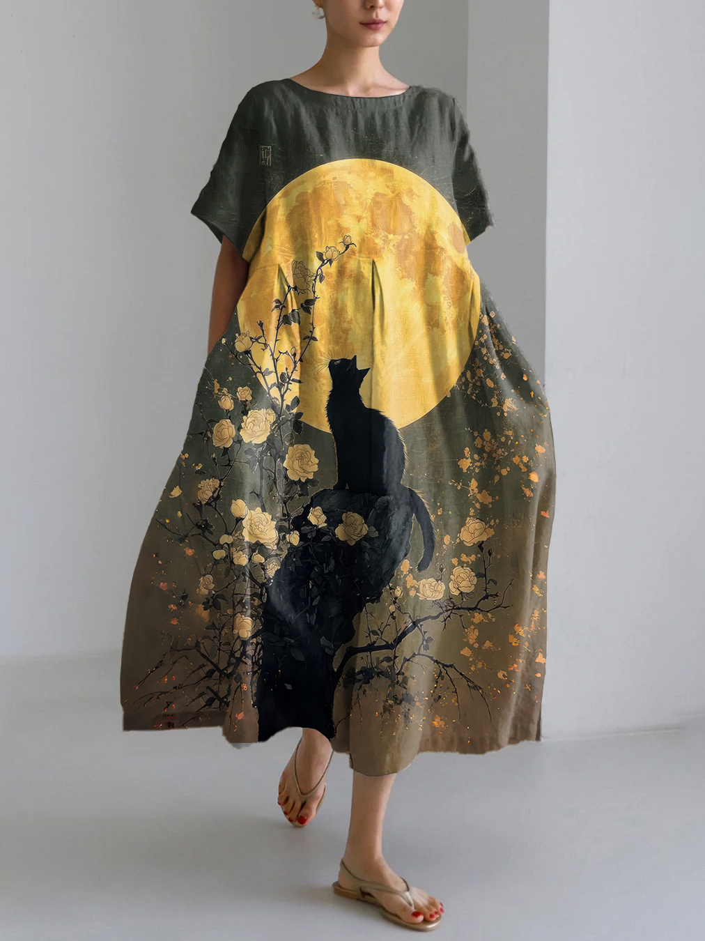 Vintage Japanese Art Flower Cat Moon Print Linen Blend Maxi Dress