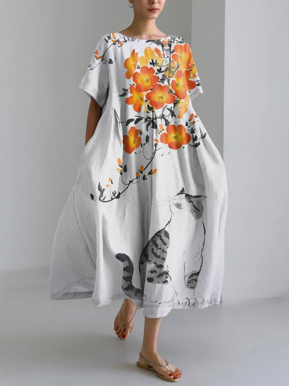 Vintage Japanese Art Flower Cat Print Linen Blend Maxi Dress